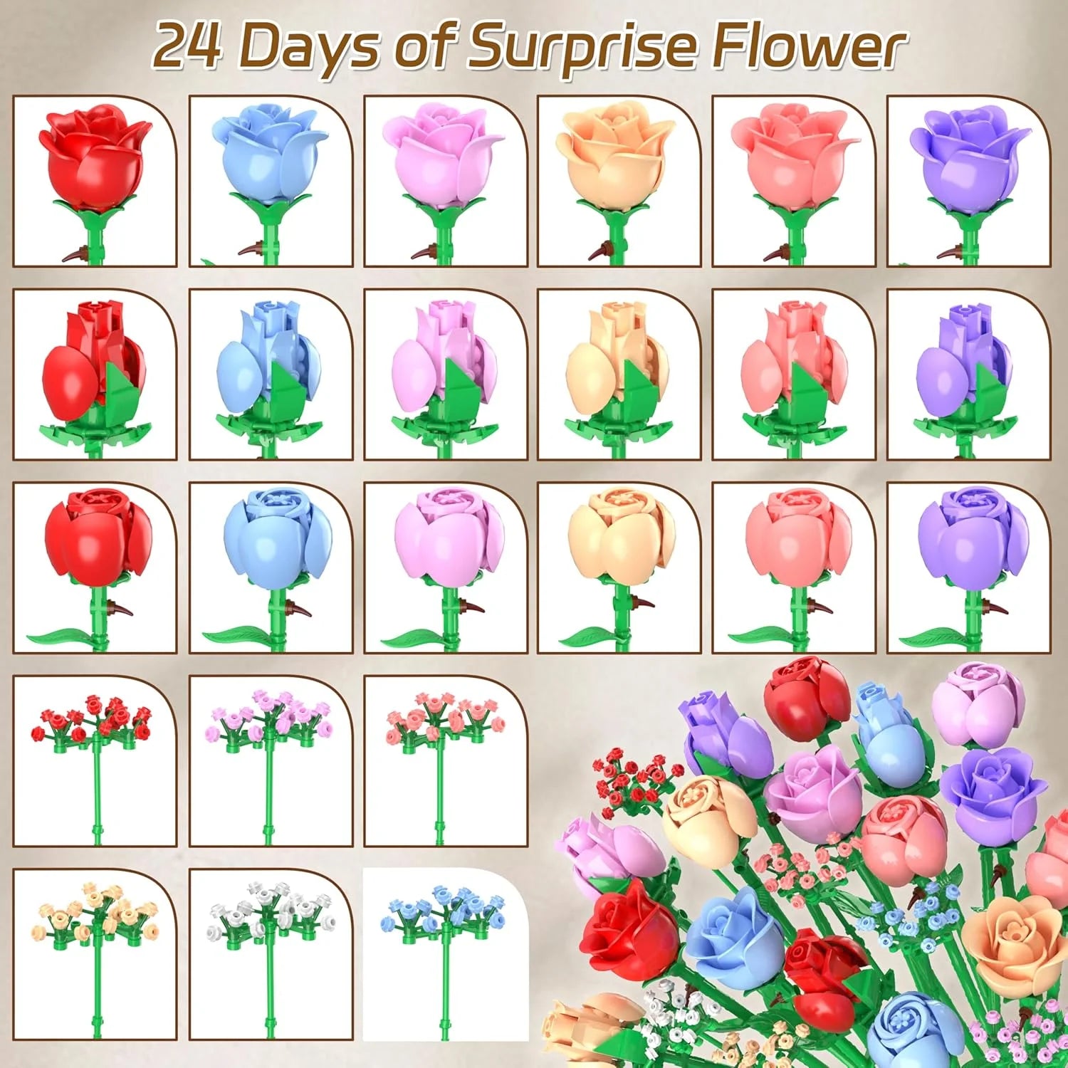 You’ll get 24 unique pieces that come together to make a full bouquet — each day adds a new surprise to your collection.