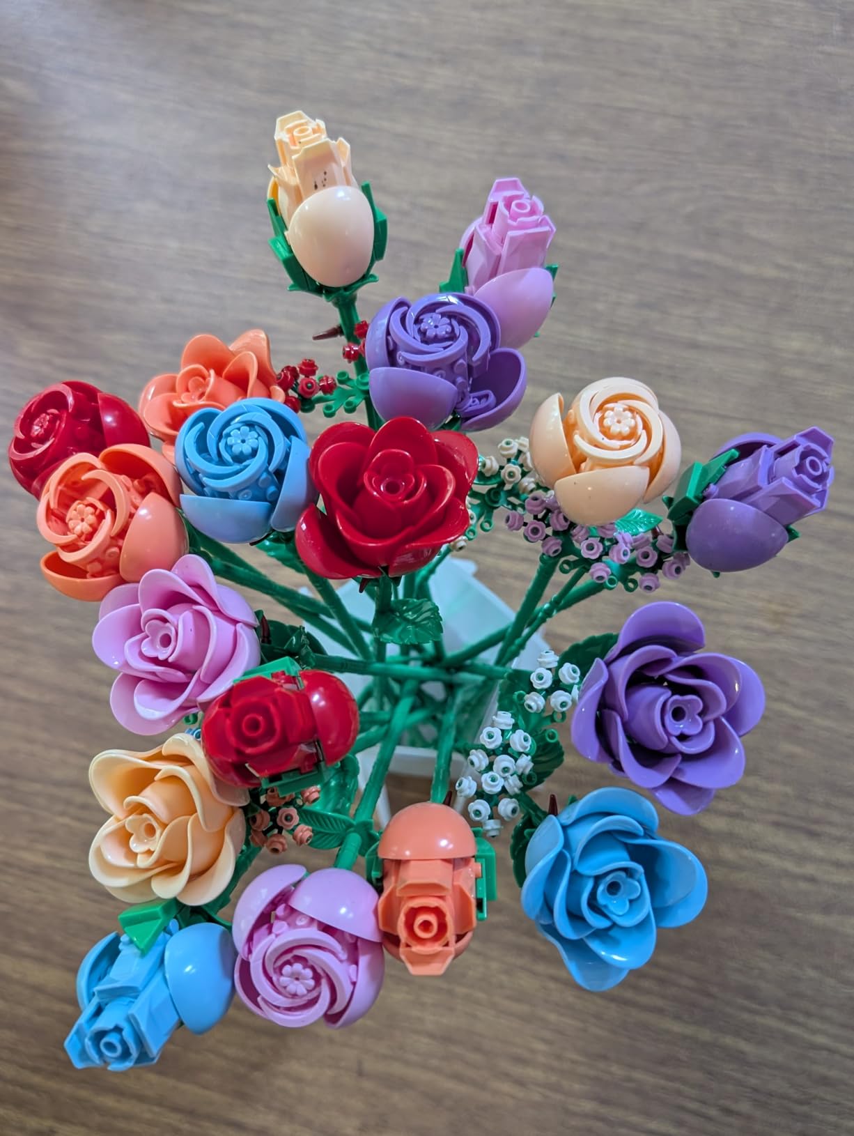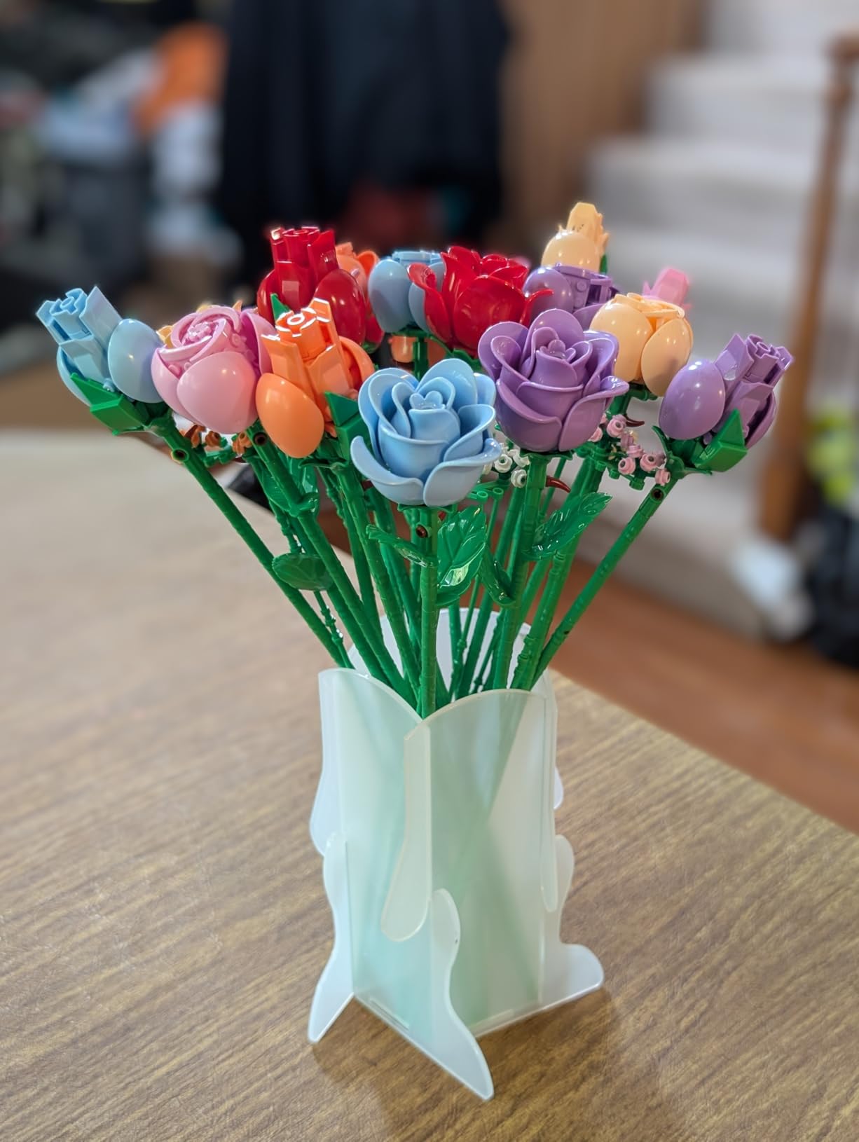 When fully assembled, the bouquet stands beautifully on display (around the size of a real flower vase arrangement). Perfect for desks, shelves, or as a centerpiece!